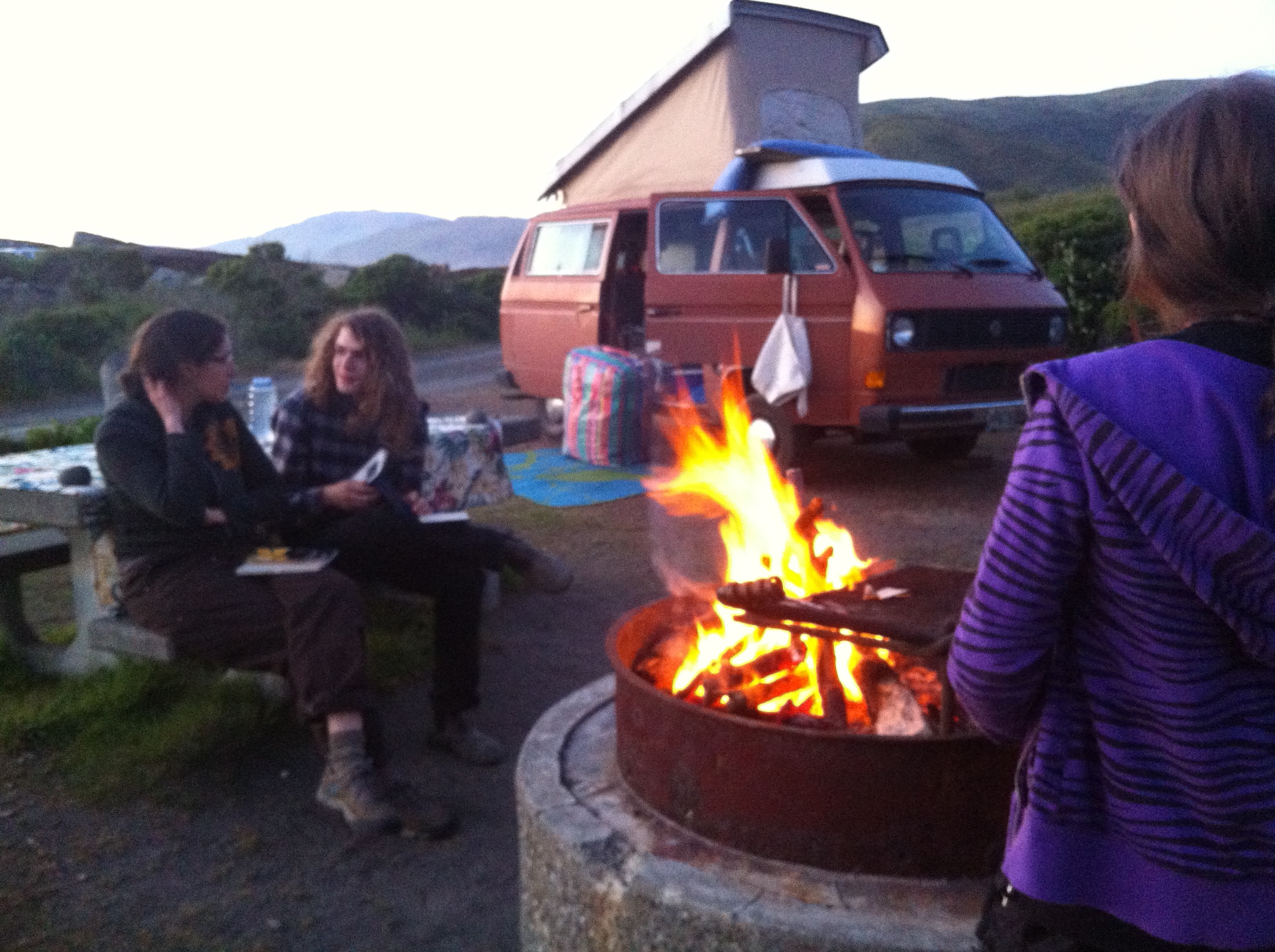 This weekend we camped out at Svensen. Joe and I slept in the VW and the Boys slept in the upstairs of the house – which is still just a big box. Our plans to spend the winter working on the interior were obviously supplanted by this Pooka ride. It was wonderful to hang out around the fire looking at the stars and the nearly full moon. A neighbor out there has Guinea Fowl, whose meowing cries lend an exotic quality to the neighborhood. Taking a bit of time “away”- even just to Svensen, gave me a bit of a chance to recapture some of the perspective from the redwood trip. As I enter into these last two weeks prior to my surgery I feel called to more contemplation, and more time in nature.