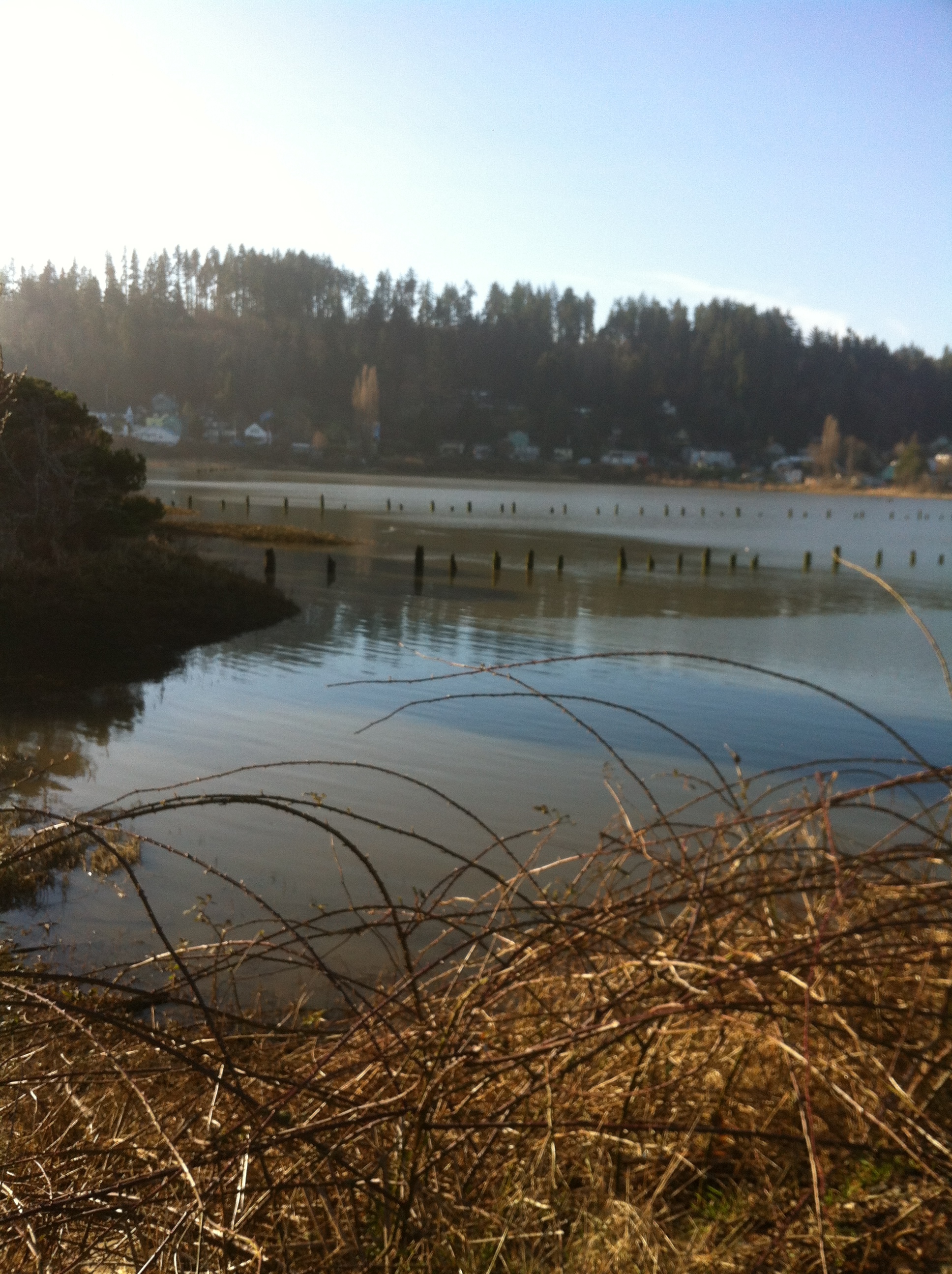 There is a railroad causeway with three trestle bridges that defines a large open tidal mudflats/bay rimmed with estuary plants. Alderbrook is nestled between state forest land and Highway 30 to the south, and the waterline to the north. Backyards, Violet LaPlant Park and the baseball field form meadow areas populated in summer with swallows swooping for insects. These three ecological niches: tidal estuary, forest, and open meadow, are intersecting and like a three legged stool provide a platform for habitat diversity. Edges are the richest areas for species to thrive.