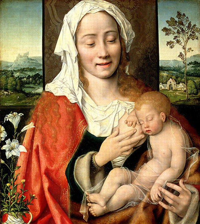 Speaking of mothers, I love how many of the old paintings of the Madonna and the Holy Child express one of the joys of motherhood, namely nursing. Have you noticed how the exposed breast is depicted as a sign of holiness? Motherhood and breasts completely entwined in these powerful images. Painted at a time in which breast feeding was the only option for feeding infants and toddlers, these beautiful religious depictions elevate a experience very familiar to most women of the late Medieval and Renaissance periods. It is one of the ways women were honored during those times.