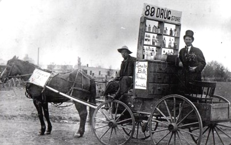 “Step right up! Step right up! Hear about the amazing healing powers of Dr. SmartyPants’ patented formula!” If pharmaceutical drugs were distributed out of the back of a charlatan wagon at a medicine show  would they have fewer takers?  Wait a moment, what about commercials for prescription drugs? You know the ones, with the huge list of possible side effects being played while beautiful actors galavant around? Or the four page ads in print media filled with small print? How different are these from the medicine shows of the old west?