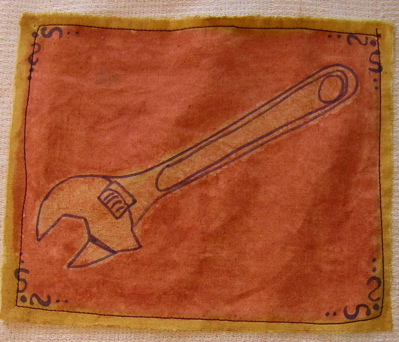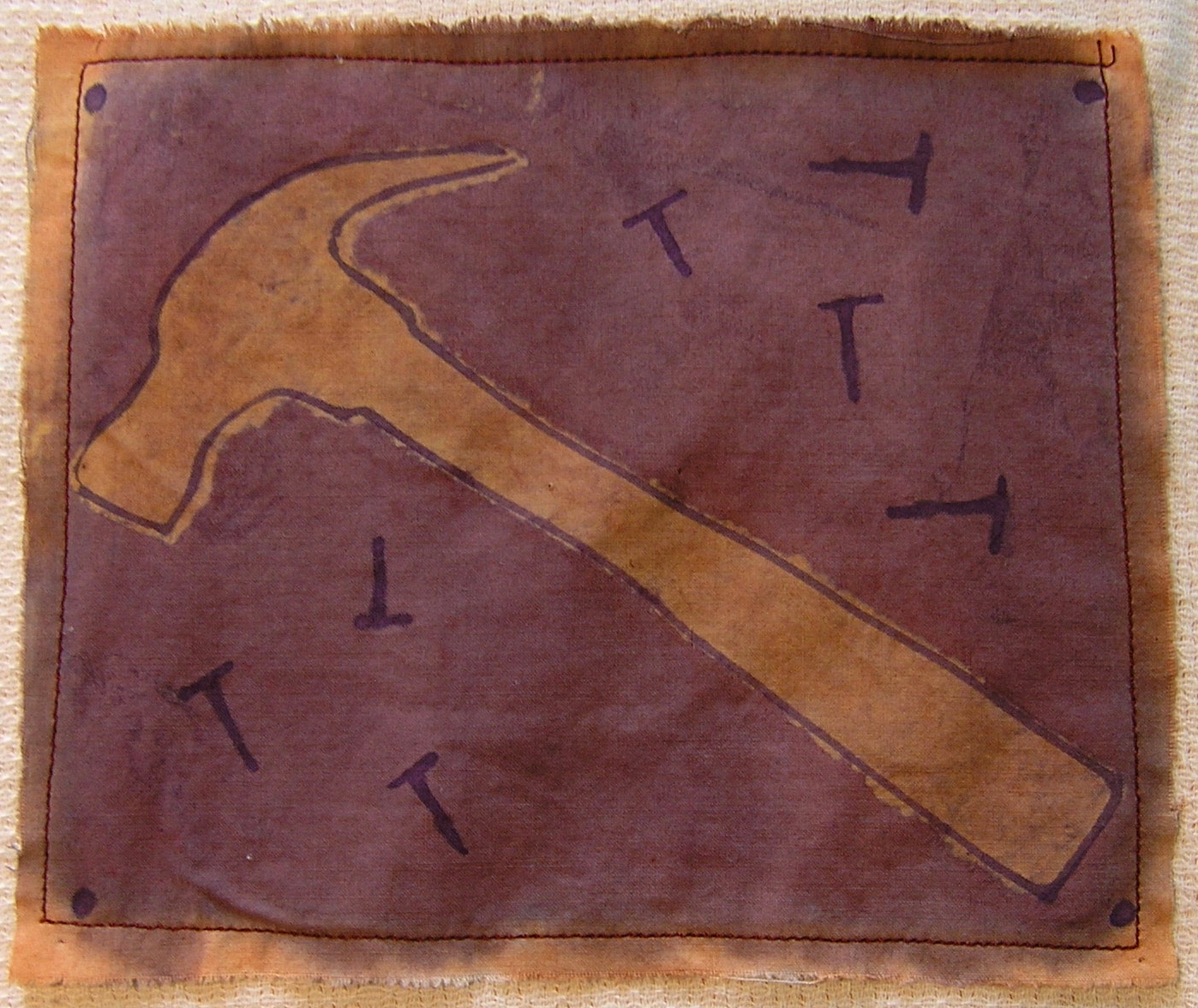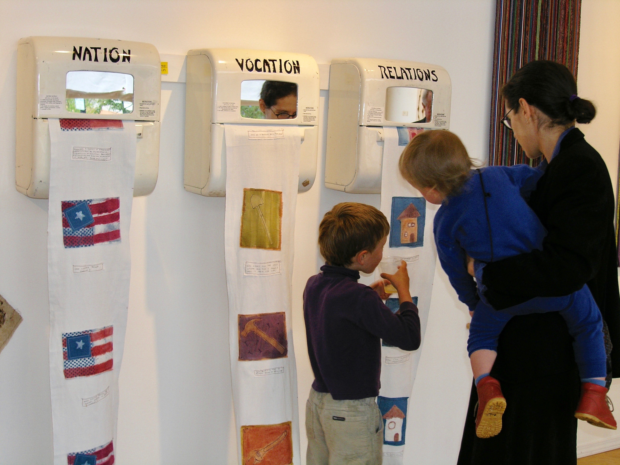 Checking out my installation with the boys June 2004.  Each pull of the towel brought a new picture with a question. Printing, stencils and painting with Natural dyes and pigments on 100% cotton.  The installation invited people to consider the state of our nation in regards to home and community, our work, and federal policy as they apply to all, especially immigrants and imprisoned peoples. +