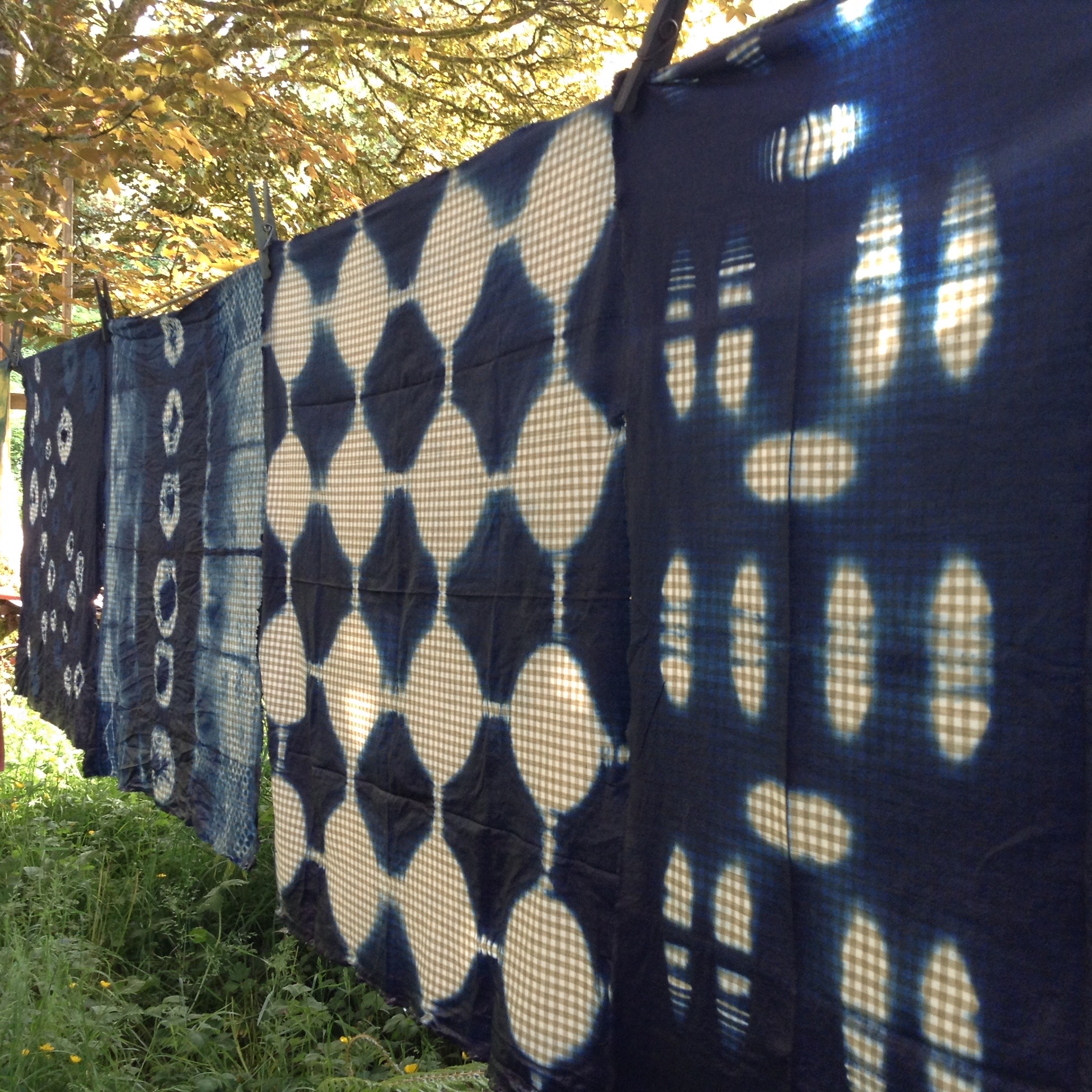 A few resist dyed indigo hanker sniffs airing on the line.